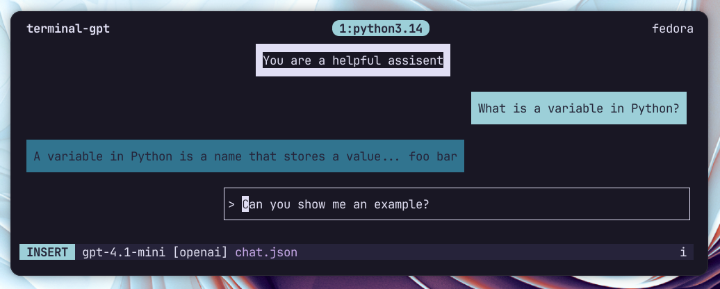 That’s why I created Terminal GPT: a terminal TUI that makes it fast and easy to edit, delete, or add messages in the conversation history. From my experience with language models, keeping the context clean is huge. Terminal GPT lets me ask a quick question about a project and, if the response isn’t relevant, delete it and retry. No browser required.